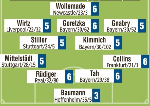 首发:沃尔特马德6分、维尔茨5分、格雷茨卡6分、格纳布里5分、斯蒂勒5分、基米希5分、米特尔施塔特5分、吕迪格6分、若纳坦-塔6分、纳姆迪-科林斯6分、鲍曼3分